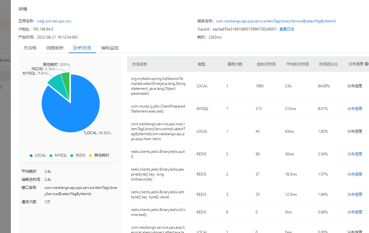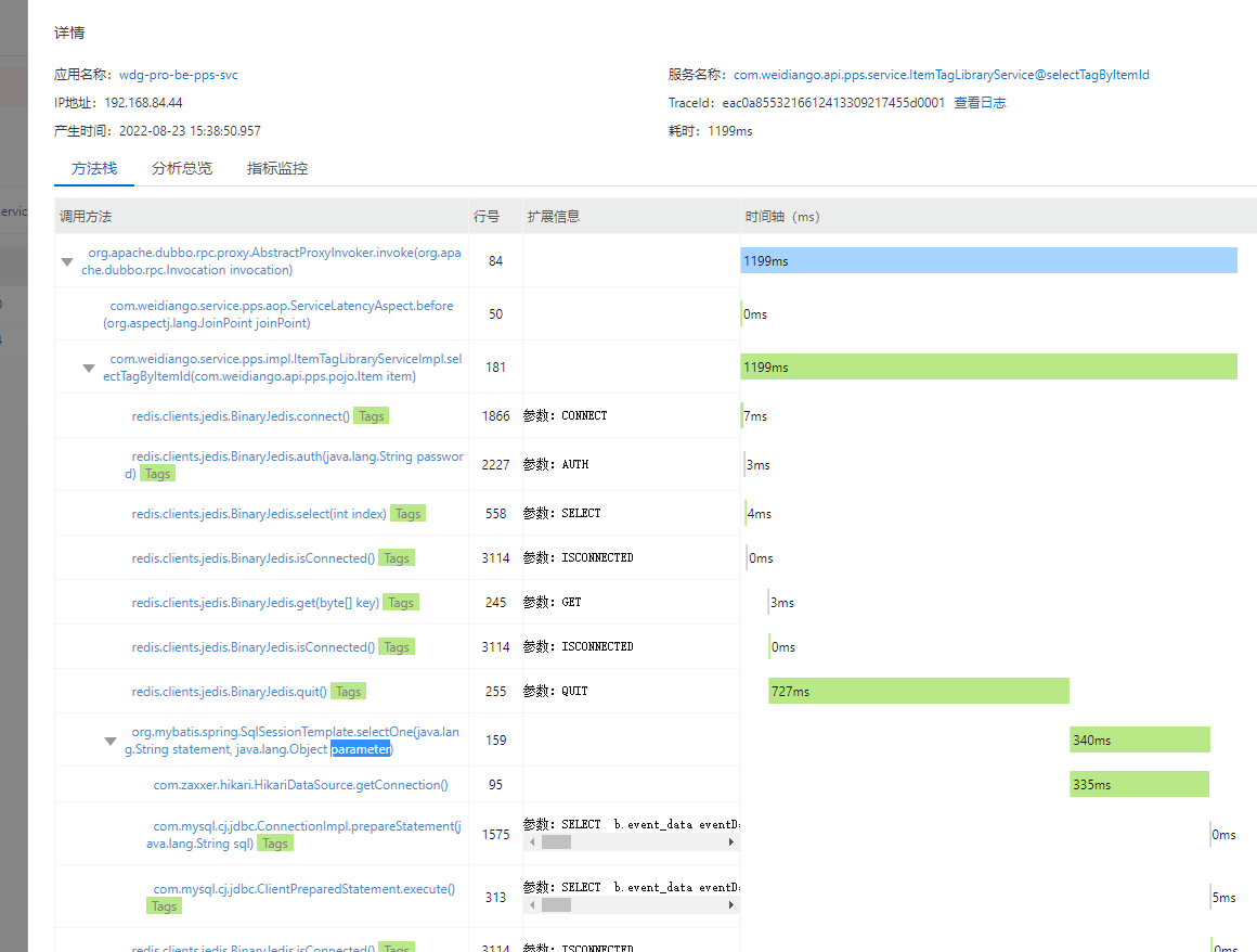 以com.weidiango.api.pps.service.ItemTagLibraryService@selectTagByItemId接口为例可以看出该接口内部执行的耗时情况