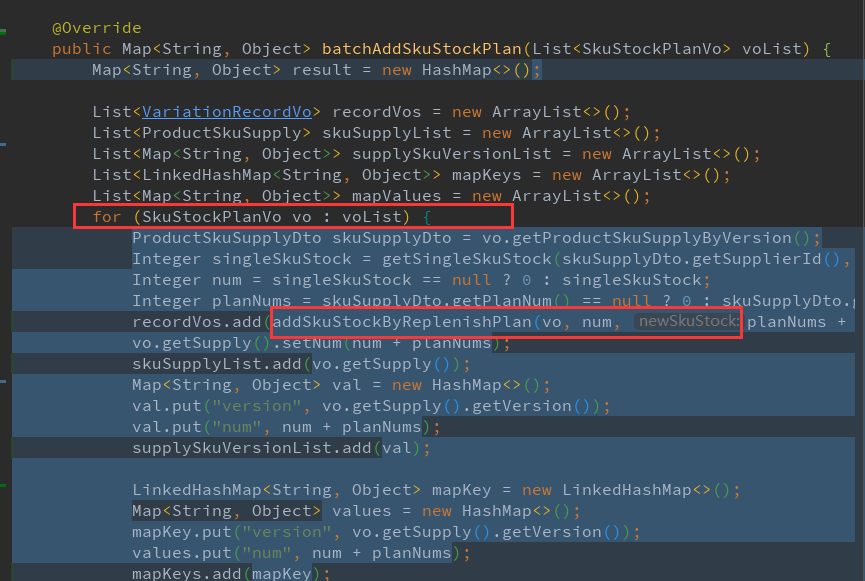 在整体调用链路中发现com.weidiango.pps.stock.impl.ProductSkuStockServiceImpl#batchAddSkuStockPlan接口时长占了总时长很大的比例, 在不影响整体业务流程的情况下, 保证这个接口入参,出参不变, 优化其中内部逻辑