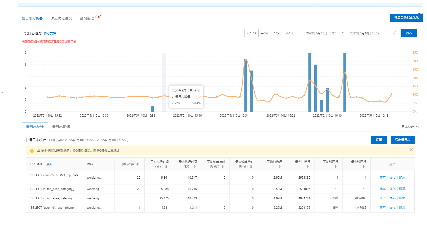 观察是因为超时接口的慢SQL导致cpu上升从而查询变慢,