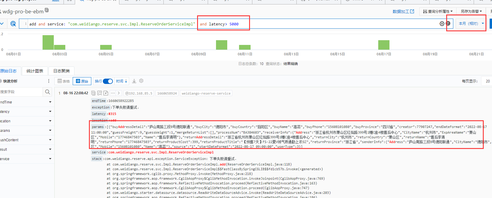 有些接口业务很复杂, 调用了很多的远程调用, 偶尔就会不明原因的超时, 这时候可以去阿里云后台开一下接口整体执行时间, 看下到底是哪个接口执行耗时导致的