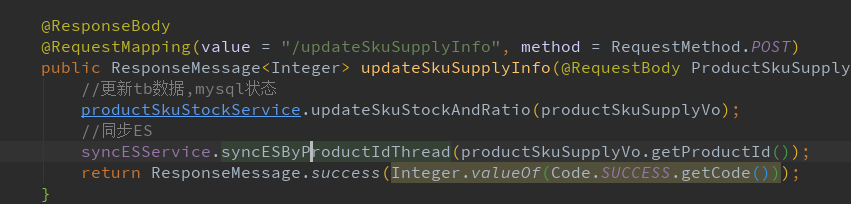 更新库存接口中, 核心逻辑修改库存执行后, 启动一个子线程同步ES, 减少用户等待时间, 需要特别注意一下, 子线程内部一定要上报异常日志, 不然子线程内部报错后不能在loghub上看到