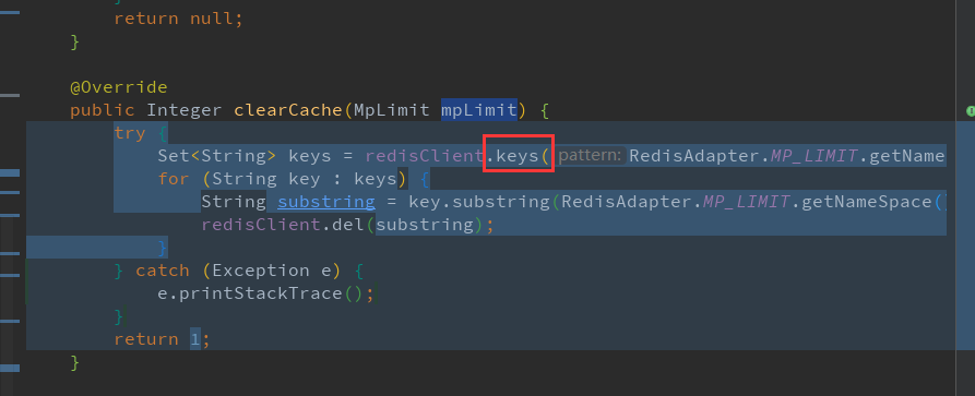 下面代码是更新了店铺选款列表的配置后, 清空对应所有店铺下的缓存, 这里使用了keys模糊查询导致线程阻塞