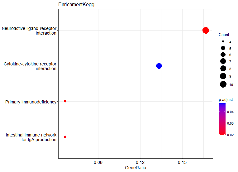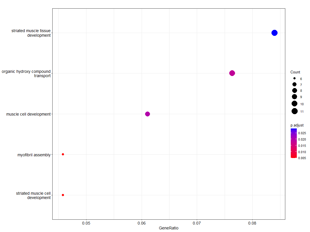 GeneRatio,意思是说输入进去的基因,它每个term(纵坐标)占整体基因的百分之多少; - 圆圈的大小代表