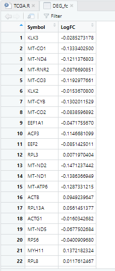 DEG_fc=data.frame('Symbol'=rownames(result),'LogFC'=result[,2],stringsAsFactors=F) #合并rownames和log2Foldchange列