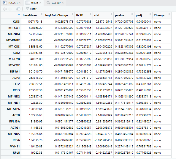 result<- read.csv(file = "Results/gleason high vs low_DESeq2差异分析/gleason high vs low_result.csv", header=T, row.names=1,check.names=FALSE)
