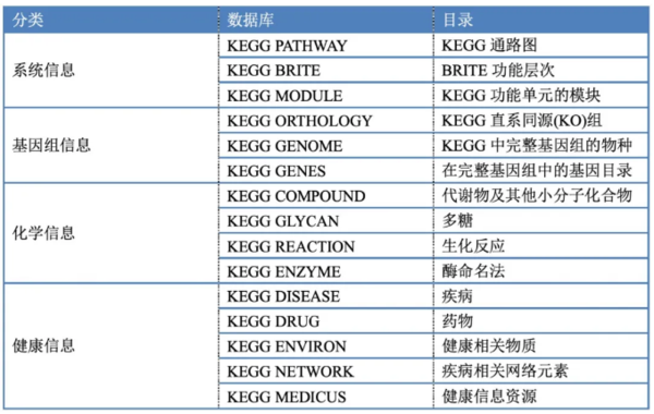 KEGG是一个综合数据库,它们大致分为系统信息、基因组信息、化学信息和健康信息四大类。进一步可细分为15个主要的数据库。