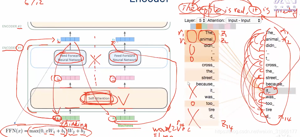 从编码器输入的句子首先会经过一个自注意力(self-attention)层,这层帮助编码器在对每个单词编码时关注输入句子的其他单词。
