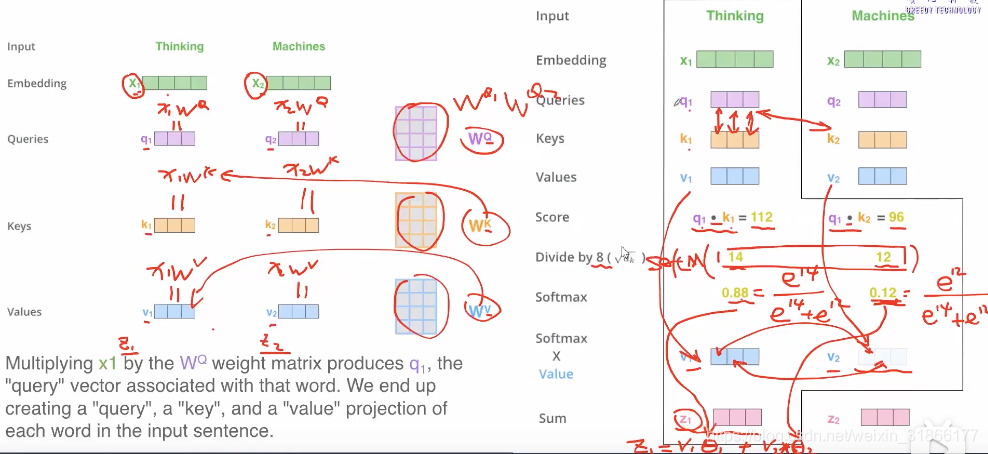 q1和k1做点击后再求和,再将q1和k2做点击后求和,如上图,q1k1=112、q1k2=96,除以一个共同的数字8,所以112/8=14、96/8=12,再将14和12经过softmax,所得到的两个值就是 和