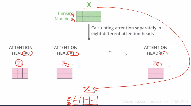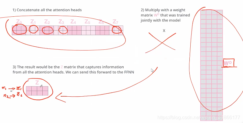 如何将不同的z0,z1转为一个Z呢?(参考FC)(这个的muti-headed attention的额外步骤,将多个head输出的z转为最终想要的Z)
