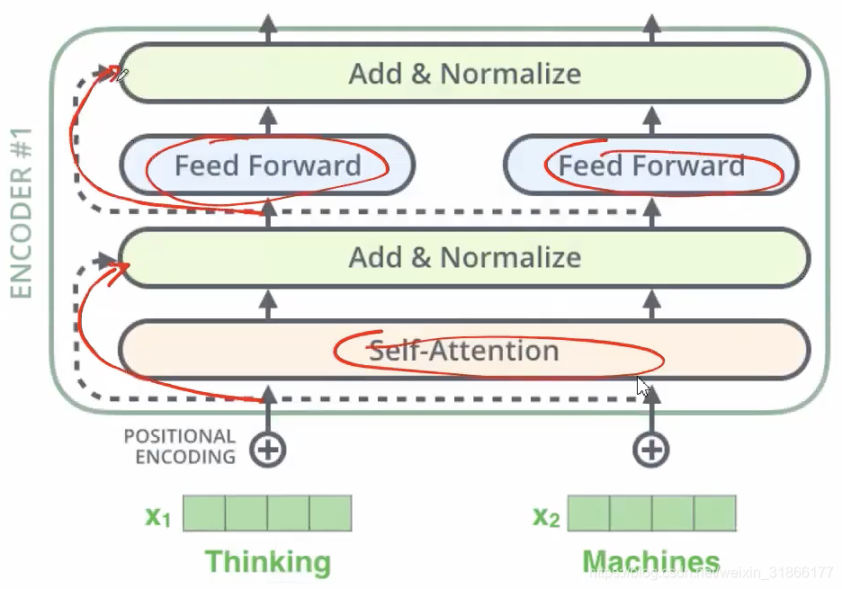 第二部分就是feed forward neural network,可以理解为一个全连接层。(x1 x2分开了)