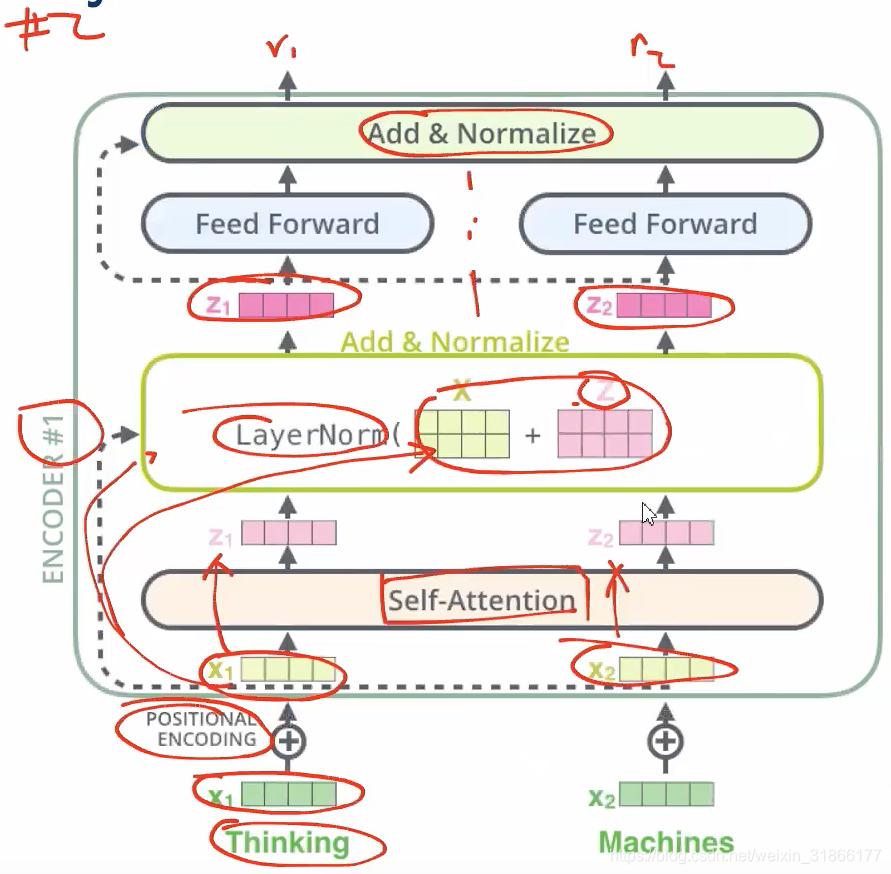 最终self-attention得到的z1\z2通过不同的FC转为r1、r2,这个r1、r2再下一个encoder中再作为x1、x2继续下去。