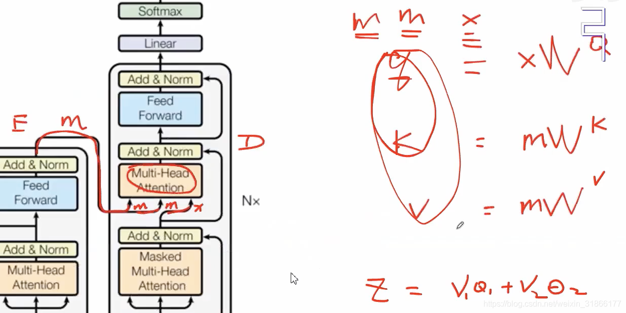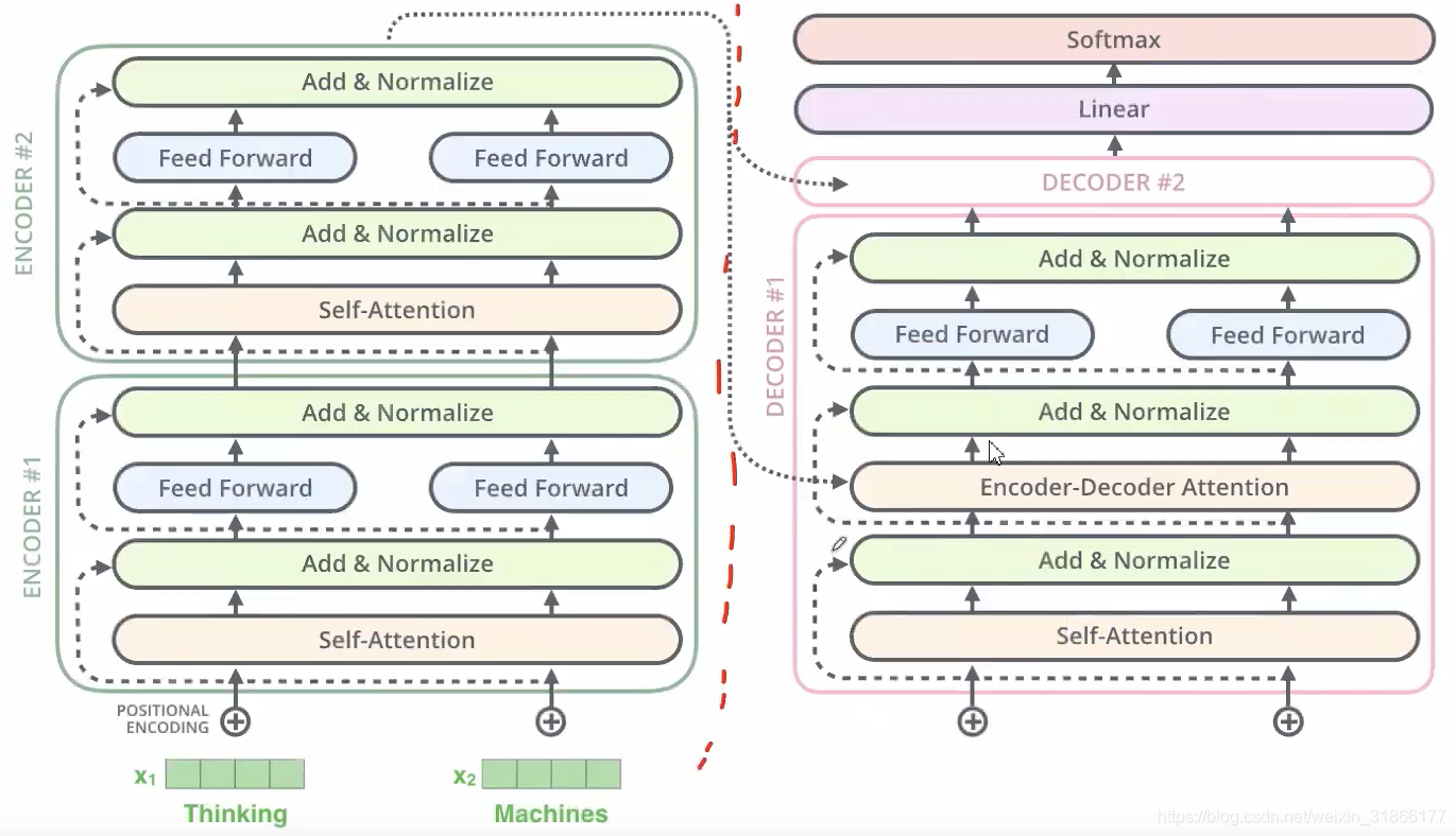Nx:是一层,类似于LSTM的内部,红色框的encoder和蓝色框的decoder都是可以叠加的。