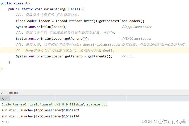 到这,相信大家对类加载器已经初步有一定的认识和理解了。接下来,我们写代码来验证一下,代码和打印结果如下: