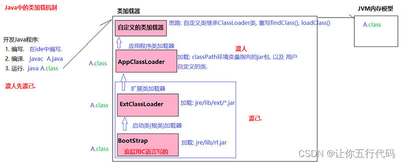 大白话解释: .Java文件是程序员能看懂,但是计算机看不懂的文件。需要先把它转换成.class文件,计算机才能识别,从而来执行。虽然这三个阶段都可以通过IDE实现,但是好多人容易忽略一个细节,那就是: 在JVM执行。class字节码文件之前, 需要先通过”类加载器”将该字节码文件加载到内存中,而这个过程,就是我们要详聊的话题。