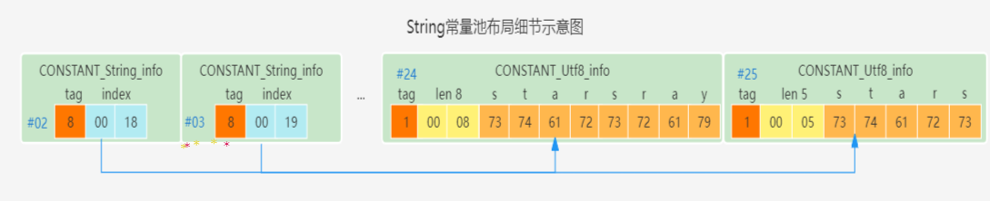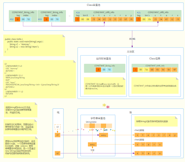 具体可以查看上面图示,结合字节码的内容也可以看出LDC会检索在字符串常量池中是否存在相同内容的引用,如果没有会创建一个实例,并将引用维护在StringTable中,其次INVOKESPECIAL会通过构造方法创建一个与字符串常量池内容相同的新的对象实例。