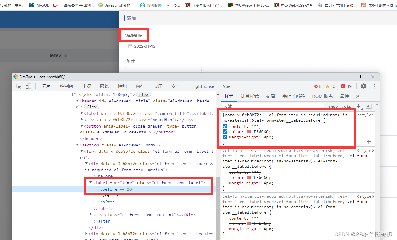 }然后这个代码的最后面那个 :before想必大家也能猜出来,这段代码的意思就是在el-form-item的label前面添加一个内容,这个内容是 content里面的*,颜色红色,看懂这段代码我们就可以进行修改了,我们可以选择直接将 before改为after这样就可以了