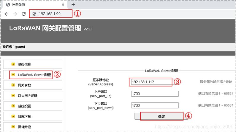 LoRaWAN Server 配置 -> 服务器地址 -> 输入 IP(本例为 192.168.1.112) -> 确定