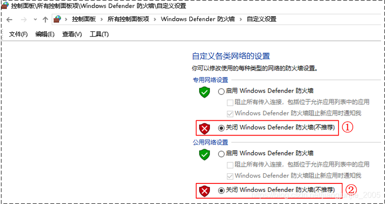 下图以 Windows 10 为例:设置 -> 查找”防火墙“ -> Windows Defender 防火墙 -> 启用或关闭 Windows Defender 防火墙 -> 关闭 Windows Defender 防火墙 -> 确定