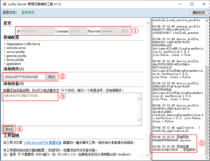 输入 LoRa Server 的 3 个信息:IP=localhost, Username=admin,Password=admin(如果是默认值,不需要填写),点击”登录“,软件自动配置 LoRa Server。