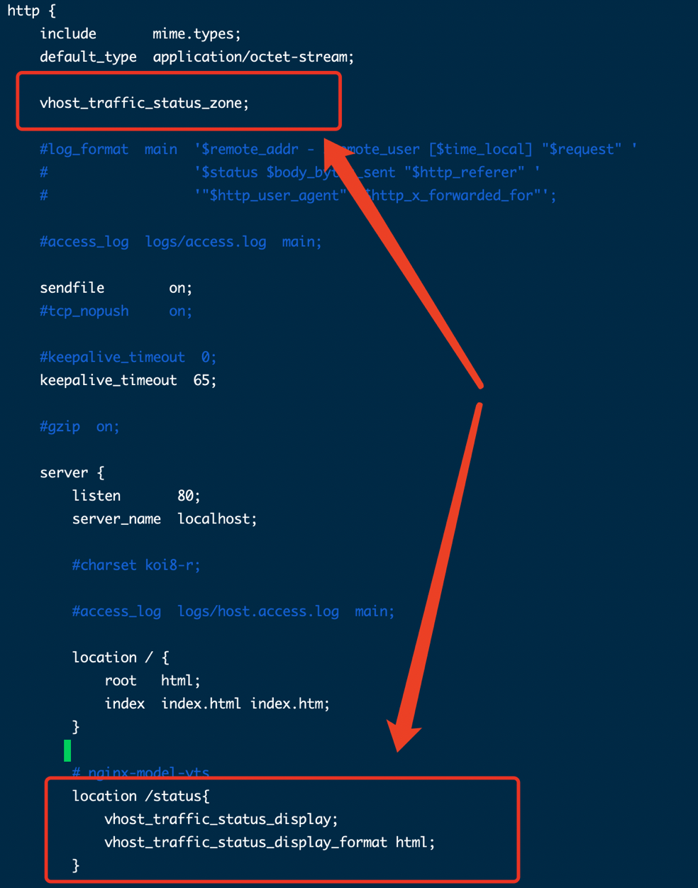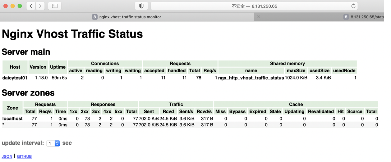 1 2 3 4 | location /status { vhost_traffic_status_display; vhost_traffic_status_display_format html; } |