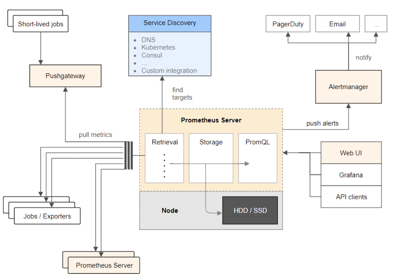 * Prometheus server 在本地存储收集到的 metrics,并运行已定义好的 alert.rules,记录新的时间序列或者向 Alertmanager 推送警报;