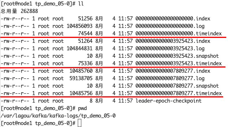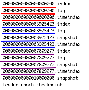 2. 一组index+log+timeindex文件的名字是一样的,并且log文件默认写满1G后,会进行logrolling形成一个新的组合来记录消息,这个是通过broker端log.segment.bytes =1073741824指定的。
