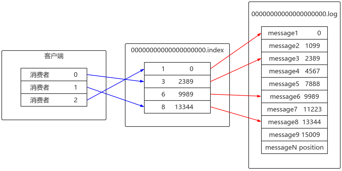 偏移量索引文件用于记录消息偏移量与物理地址之间的映射关系。