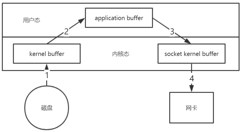 传统方式实现:先读取、再发送,实际经过1~4四次copy。