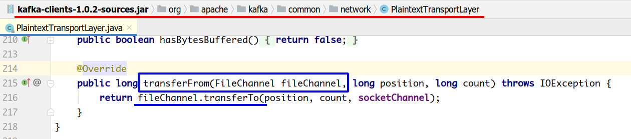 具体来看,Kafka 的数据传输通过 TransportLayer 来完成,其子类 PlaintextTransportLayer 通过Java NIO 的 FileChannel 的 transferTo 和 transferFrom 方法实现零拷贝。
