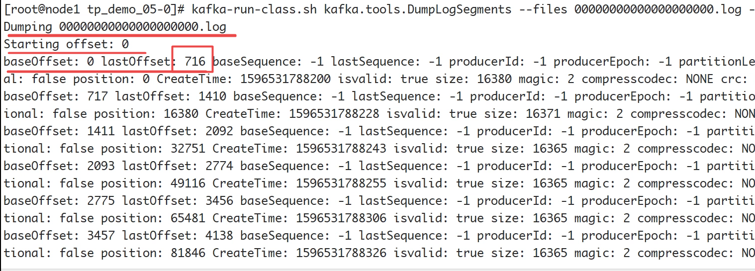Dumping 00000000000000000000.log Starting offset: 0 baseOffset: 0 lastOffset: 716 baseSequence: -1 lastSequence: -1 producerId: -1 producerEpoch: -1 partitionLeaderEpoch: 0 isTransactional: false position: 0 CreateTime: 1596513421661 isvalid: true size: 16380 magic: 2 compresscodec: NONE crc: 2973274901 baseOffset: 717 lastOffset: 1410 baseSequence: -1 lastSequence: -1 producerId: -1 producerEpoch: -1 partitionLeaderEpoch: 0 isTransactional: false position: 16380 CreateTime: 1596513421715 isvalid: true size: 16371 magic: 2 compresscodec: NONE crc: 1439993110 baseOffset: 1411 lastOffset: 2092 baseSequence: -1 lastSequence: -1 producerId: -1 producerEpoch: -1 partitionLeaderEpoch: 0 isTransactional: false position: 32751 CreateTime: 1596513421747 isvalid: true size: 16365 magic: 2 compresscodec: NONE crc: 3528903590 baseOffset: 2093 lastOffset: 2774 baseSequence: -1 lastSequence: -1 producerId: -1 producerEpoch: -1 partitionLeaderEpoch: 0 isTransactional: false position: 49116 CreateTime: 1596513421791 isvalid: true size: 16365 magic: 2 compresscodec: NONE crc: 763876977 baseOffset: 2775 lastOffset: 3456 baseSequence: -1 lastSequence: -1 producerId: -1 producerEpoch: -1 partitionLeaderEpoch: 0 isTransactional: false position: 65481 CreateTime: 1596513421795 isvalid: true size: 16365 magic: 2 compresscodec: NONE crc: 2218198476 baseOffset: 3457 lastOffset: 4138 baseSequence: -1 lastSequence: -1 producerId: -1 producerEpoch: -1 partitionLeaderEpoch: 0 isTransactional: false position: 81846 CreateTime: 1596513421798 isvalid: true size: 16365 magic: 2 compresscodec: NONE crc: 4018065070 baseOffset: 4139 lastOffset: 4820 baseSequence: -1 lastSequence: -1 producerId: -1 producerEpoch: -1 partitionLeaderEpoch: 0 isTransactional: false position: 98211 CreateTime: 1596513421802 isvalid: true size: 16365 magic: 2 compresscodec: NONE crc: 3073882858 baseOffset: 4821 lastOffset: 5502 baseSequence: -1 lastSequence: -1 producerId: -1 producerEpoch: -1 partitionLeaderEpoch: 0 isTransactional: false position: 114576 CreateTime: 1596513421819 isvalid: true size: 16365 magic: 2 compresscodec: NONE crc: 207330377 [root@node1 tp_demo_05-0]#