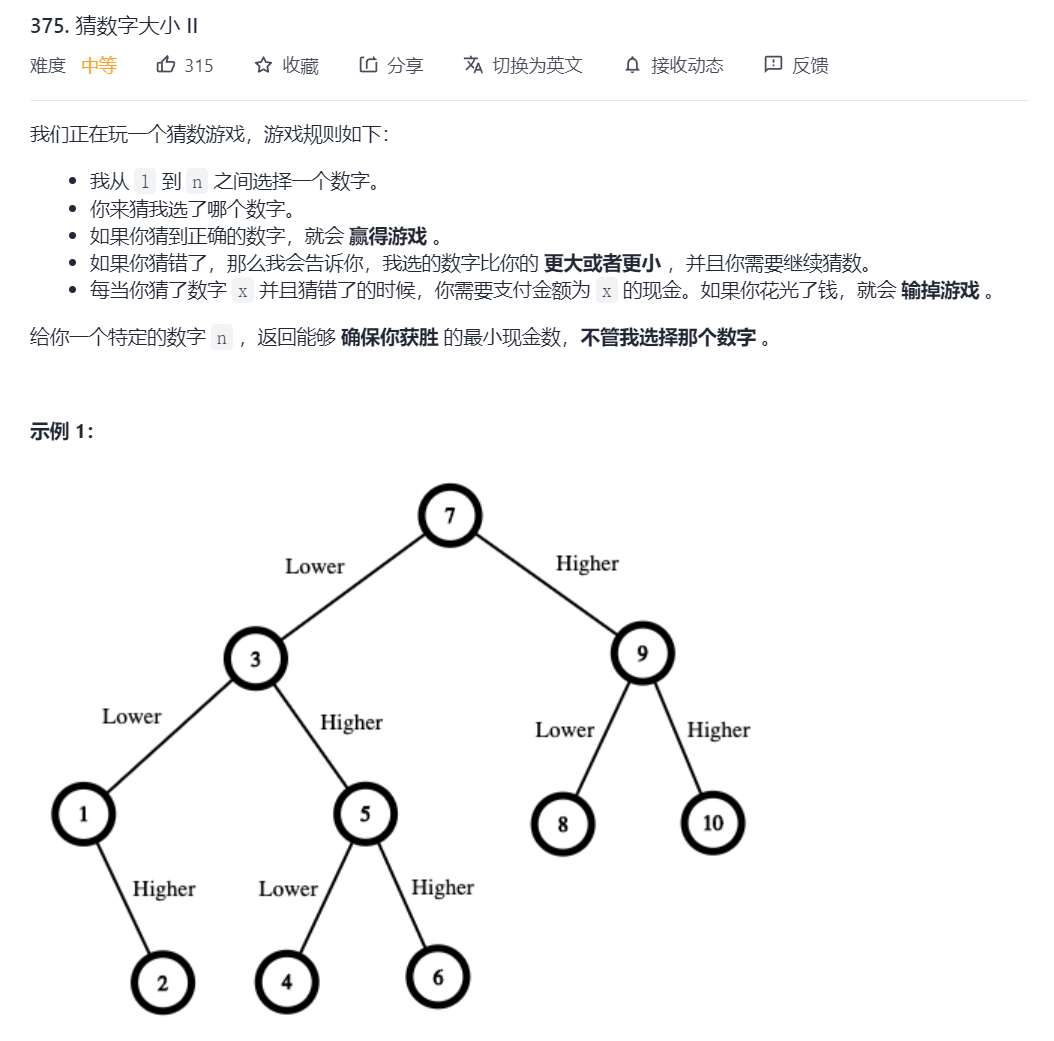 为了将支付的金额最小化,除了需要将每次支付的金额控制在较低值以外,还需要在猜数字的过程中缩小所选数字的范围。当猜了数字 xx 并且猜错时,会知道 xx 比所选数字大还是小。如果 xx 比所选数字大,则任何比 xx 大的数字一定都比所选数字大,因此应该在比 xx 小的数字中继续猜数字。如果 xx 比所选数字小,同理可知应该在比 xx 大的数字中继续猜数字。