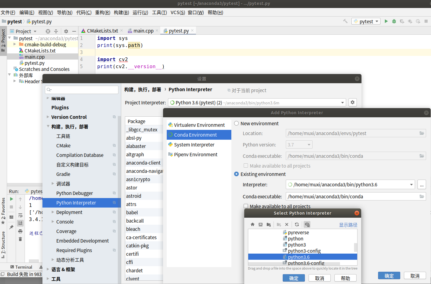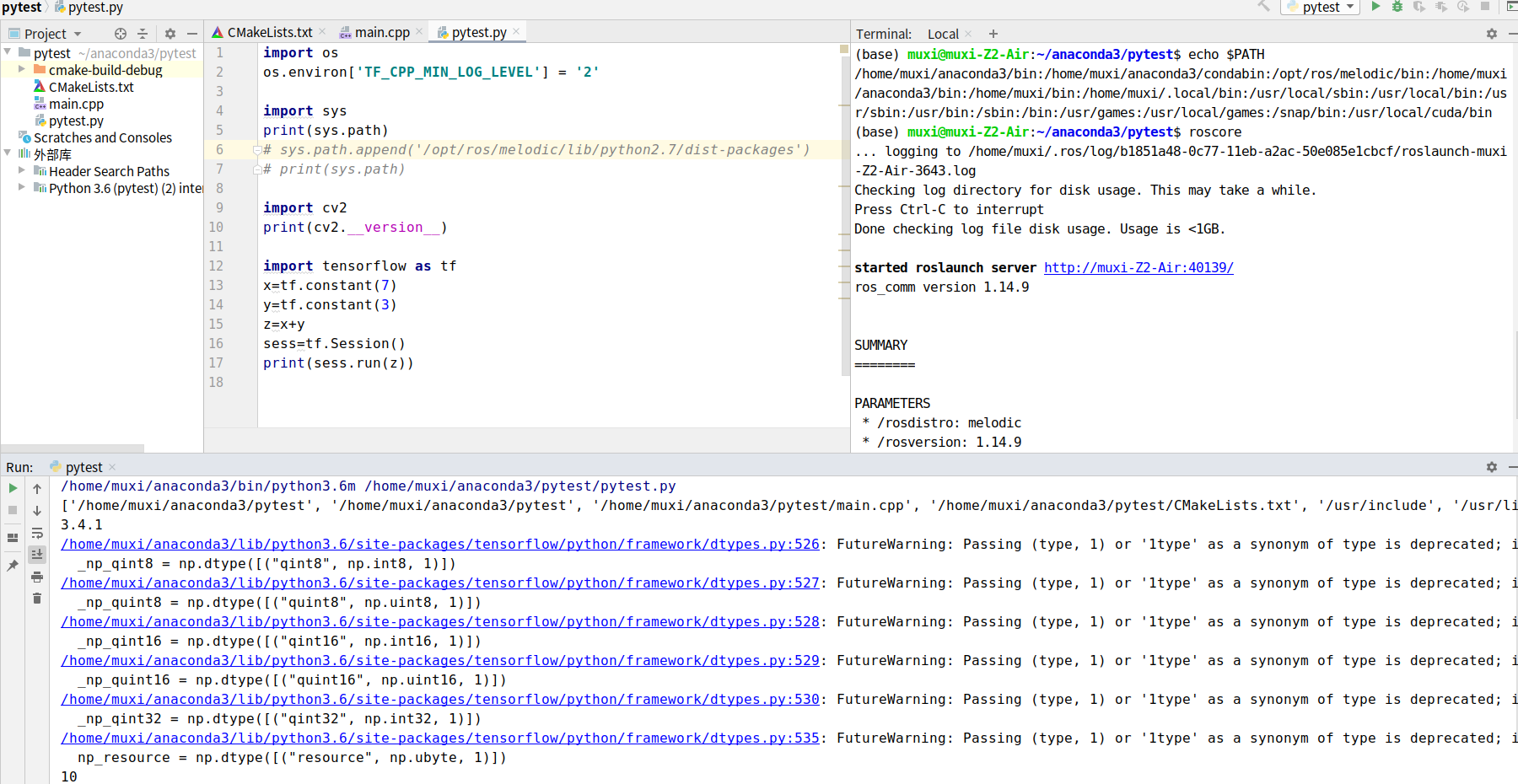 在CLion和终端下分别测试cv2和tensorflow,都能在roscore存在下成功,不用remove关于ros的path。