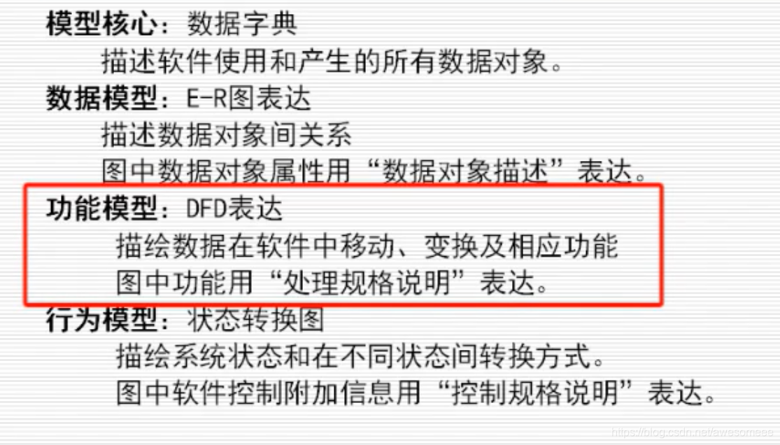 - 信息描述:给出软件必须解决的问题的系统描述,记录信息内容、信息流和信息结构