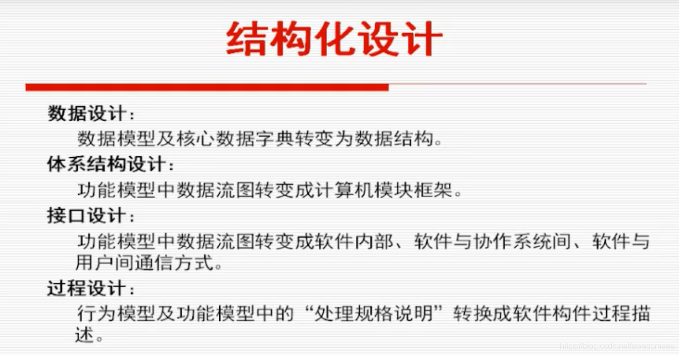 - 设计阶段。系统设计和详细设计。系统设计:设计软件系统的体系结构,也包括软件系统的组成成分、各个成分的功能和接口、成分之间的连接和通信,数据库。详细设计:各个部分的实现细节,包括数据结构和算法