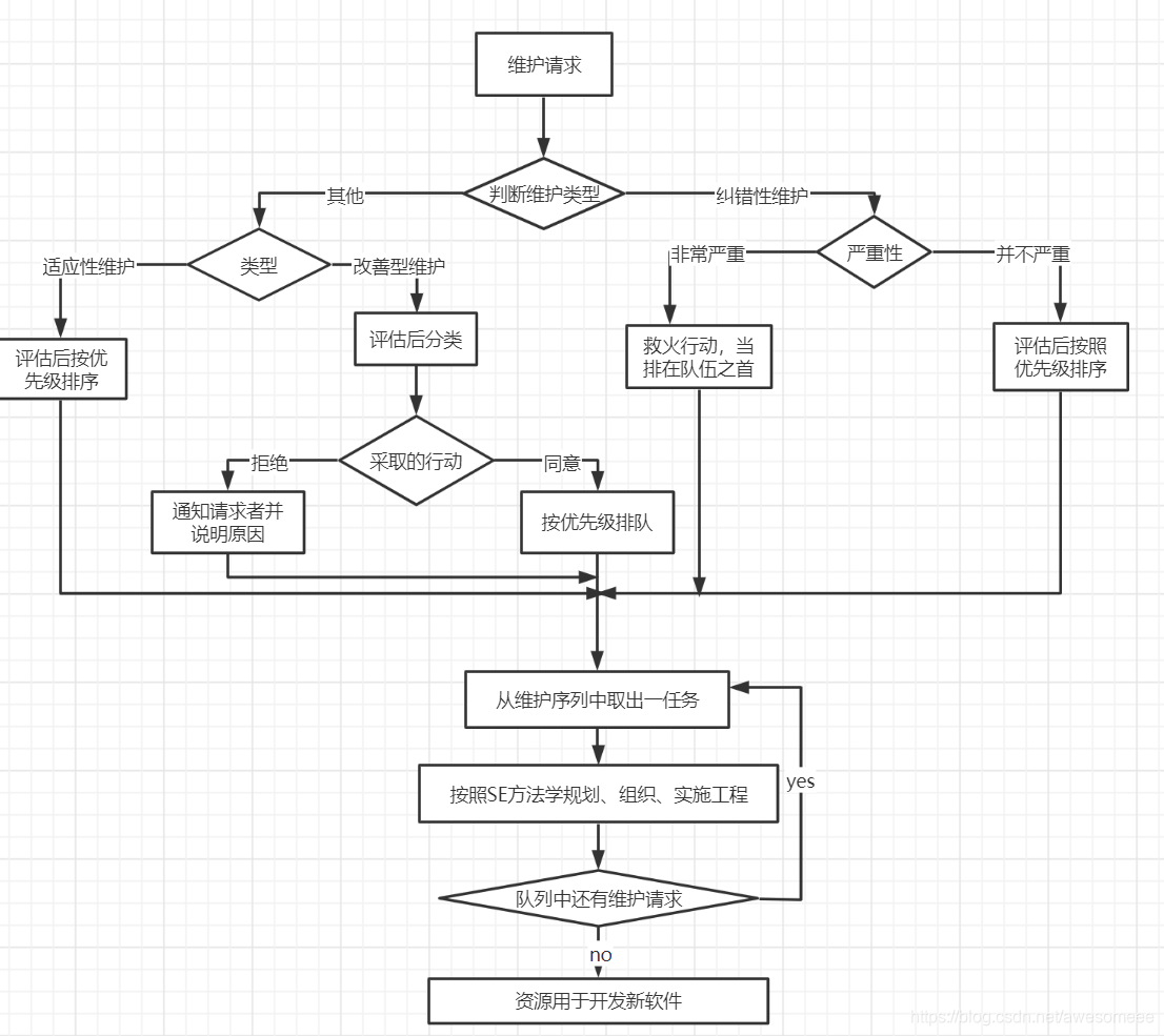 - 运行和维护。软件运行阶段,对投入运行的软件进行维护