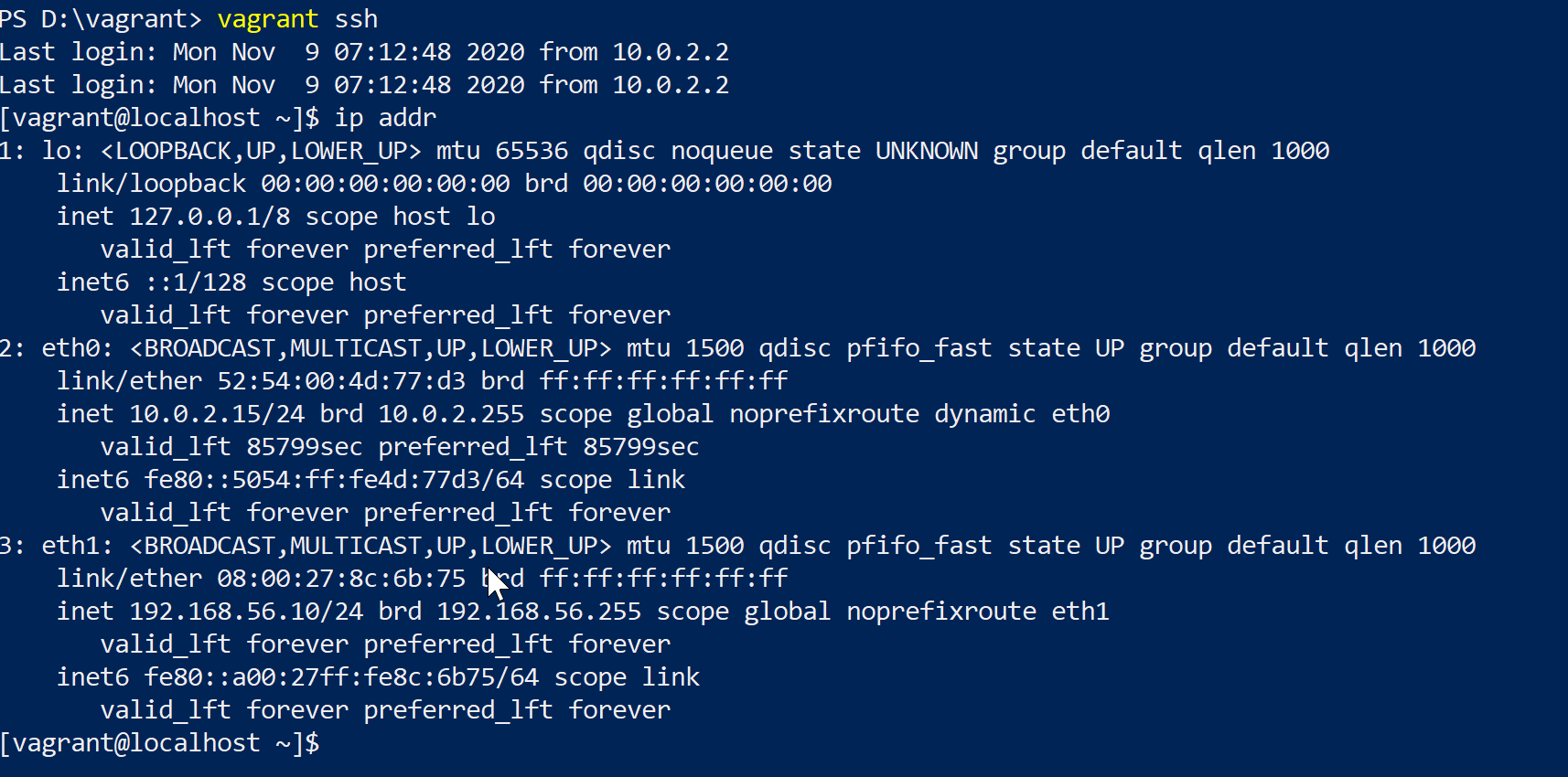 vagrant up来启动,如下:PS D:\vagrant> vagrant up Bringing machine 'default' up with 'virtualbox' provider... ==> default: Checking if box 'centos/7' version '2004.01' is up to date... ==> default: Clearing any previously set forwarded ports... ==> default: Clearing any previously set network interfaces... ==> default: Preparing network interfaces based on configuration... default: Adapter 1: nat ==> default: Forwarding ports... default: 22 (guest) => 2222 (host) (adapter 1) ==> default: Booting VM... ==> default: Waiting for machine to boot. This may take a few minutes... default: SSH address: 127.0.0.1:2222 default: SSH username: vagrant default: SSH auth method: private key ==> default: Machine booted and ready! ==> default: Checking for guest additions in VM... default: No guest additions were detected on the base box for this VM! Guest default: additions are required for forwarded ports, shared folders, host only default: networking, and more. If SSH fails on this machine, please install default: the guest additions and repackage the box to continue. default: default: This is not an error message; everything may continue to work properly, default: in which case you may ignore this message. ==> default: Rsyncing folder: /cygdrive/d/vagrant/ => /vagrant ==> default: Machine already provisioned. Run `vagrant provision` or use the `--provision` ==> default: flag to force provisioning. Provisioners marked to run always will still run.启动后我们可以通过