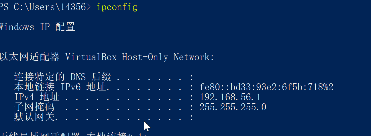 Windows电脑的IP,其中有个网卡VirtualBox Host-Only Network。,这就是虚拟机的网卡,看到其IP地址段