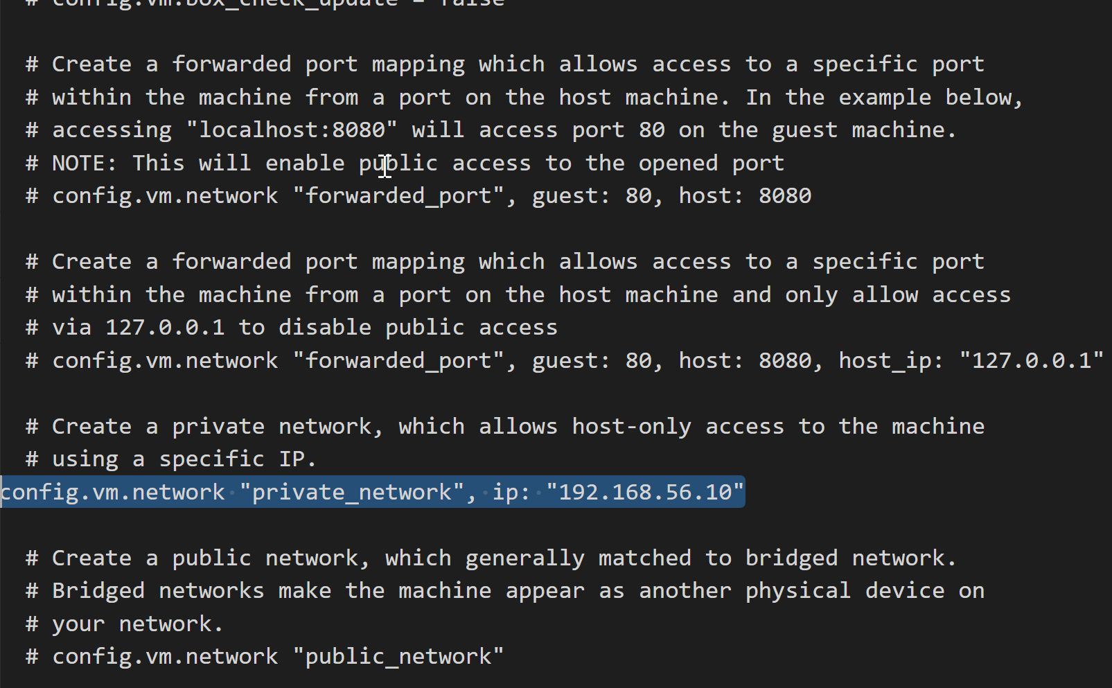 vagrant的目录下的Vagrantfile文件中就行配置修改,这是我们刚才创建的虚拟机的配置文件 ,配置config.vm.network "private_network", ip: "192.168.56.10",如下所示: