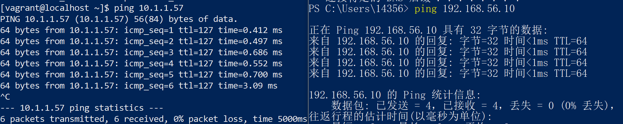 192.168.56.1,那么我们将这台的配置为192.168.56.10,配置好之后需要重启虚拟机,通过vagrant reload,进行重启,重启后我们可以验证其与主机是否能互通
