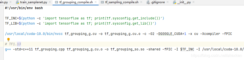我并不懂这个so文件的相关技术细节,只是知道这个文件是一系列混合编译文件的一个链接接口,由sh脚本生成。不能生成so文件,说明是和脚本文件有关系。我们打开对应的脚本,来查看细节,以tf_grouping_compile.sh为例: