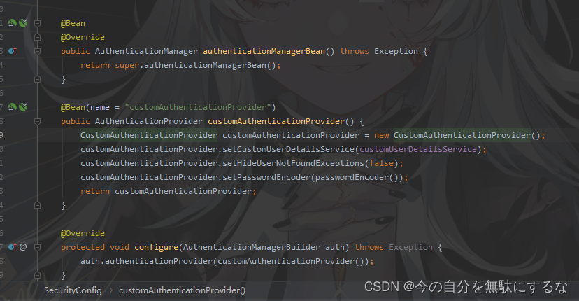 2. 在 SecurityConfig 里面加上整两个方法,让security走我们 CustomAuthenticationProvider 中的验证