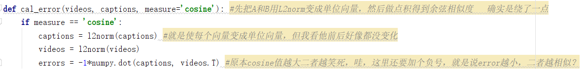 此外,可以加个负号之后,得到误差函数:error= -1 *cosine(a,b),这样的话error值越小,两向量越相似,这样更加直观。