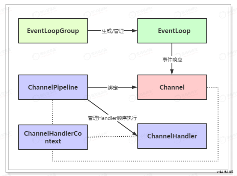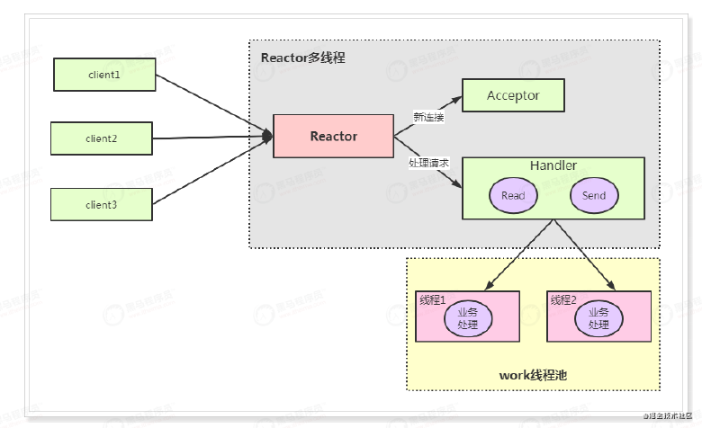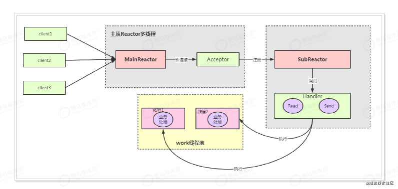 单线程模型、多线程模型、主从多线程模型。netty非常友好支持前面三种模型,一般采用主从架构方式。- Reactor模型三种角色
