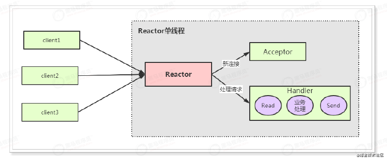 c Handler 将自身和事件绑定,执行读写操作(完成channel的读入,执行业务逻辑并将结果写道channel)。2.2.1 单线程模型