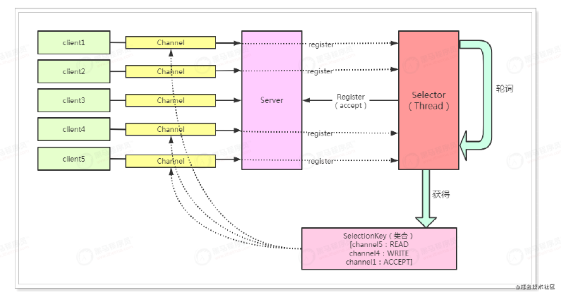 Selector不断轮询其上面的Channel,Channel发生读或者写,就会被Slector挑选出来。然后通过SelectionKey获取就绪Channel集合,进行IO读写操作。- 对上图进行分析