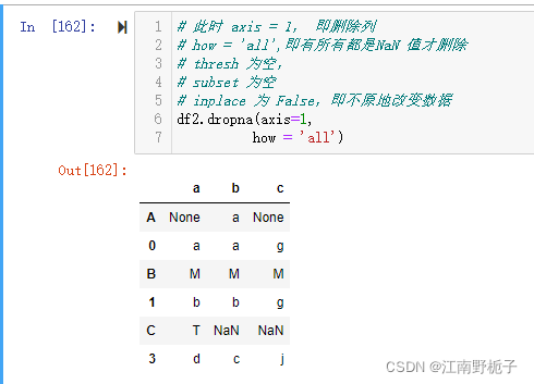 当 axis =1 时候,how = 'all', 即有所有都是 NaN 值才删除,没有符合条件的列,所以未删除。