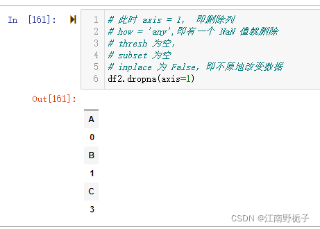 当 axis =1 时候,subset=['A'],即删除 ‘A’ 中有 NaN 值的列。