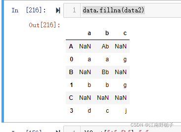 填充之后的结果可以看到,被填充的 DataFrame 数据来源于 value 指定的 DataFrame 所在位置的数值。