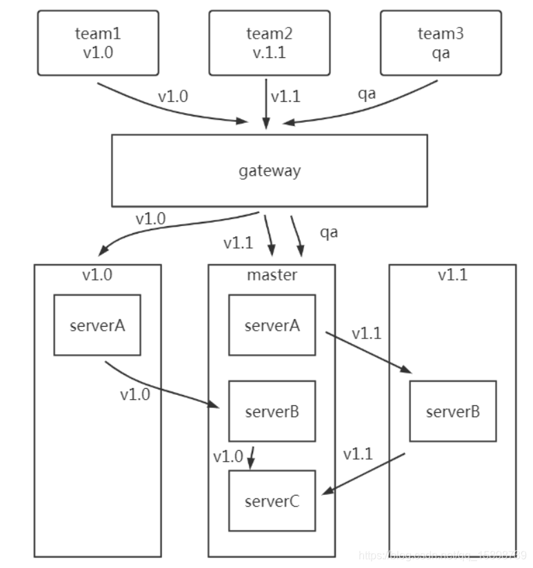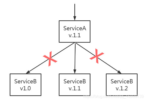 某一个微服务,有多个版本并行开发时,后端联调时调用容易错乱。例如这个例子,1.1版本的服务A需要调用1.1版本的服务B,但实际上能调用到吗???