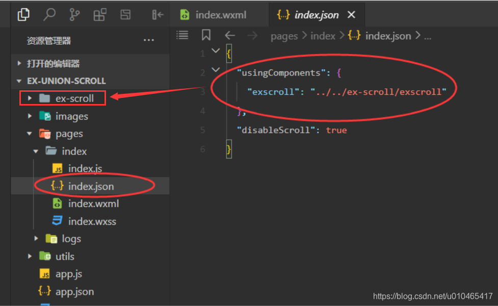 1、在你的界面文件 wxml 对应的 json 文件中引入该组件